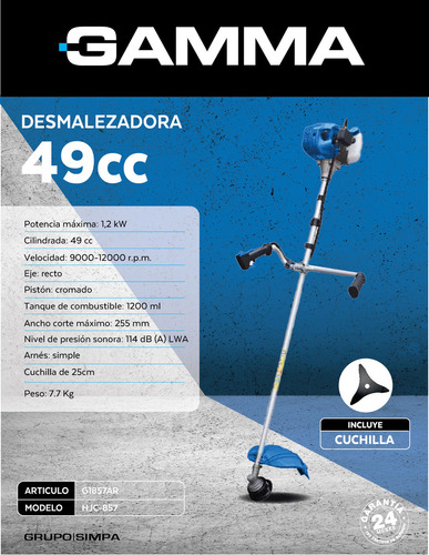 La desmalezadora a explosión Gamma G1857AR de 49cc es una herramienta potente diseñada para trabajos de corte en áreas con vegetación densa, ideal para uso doméstico y semi-profesional.